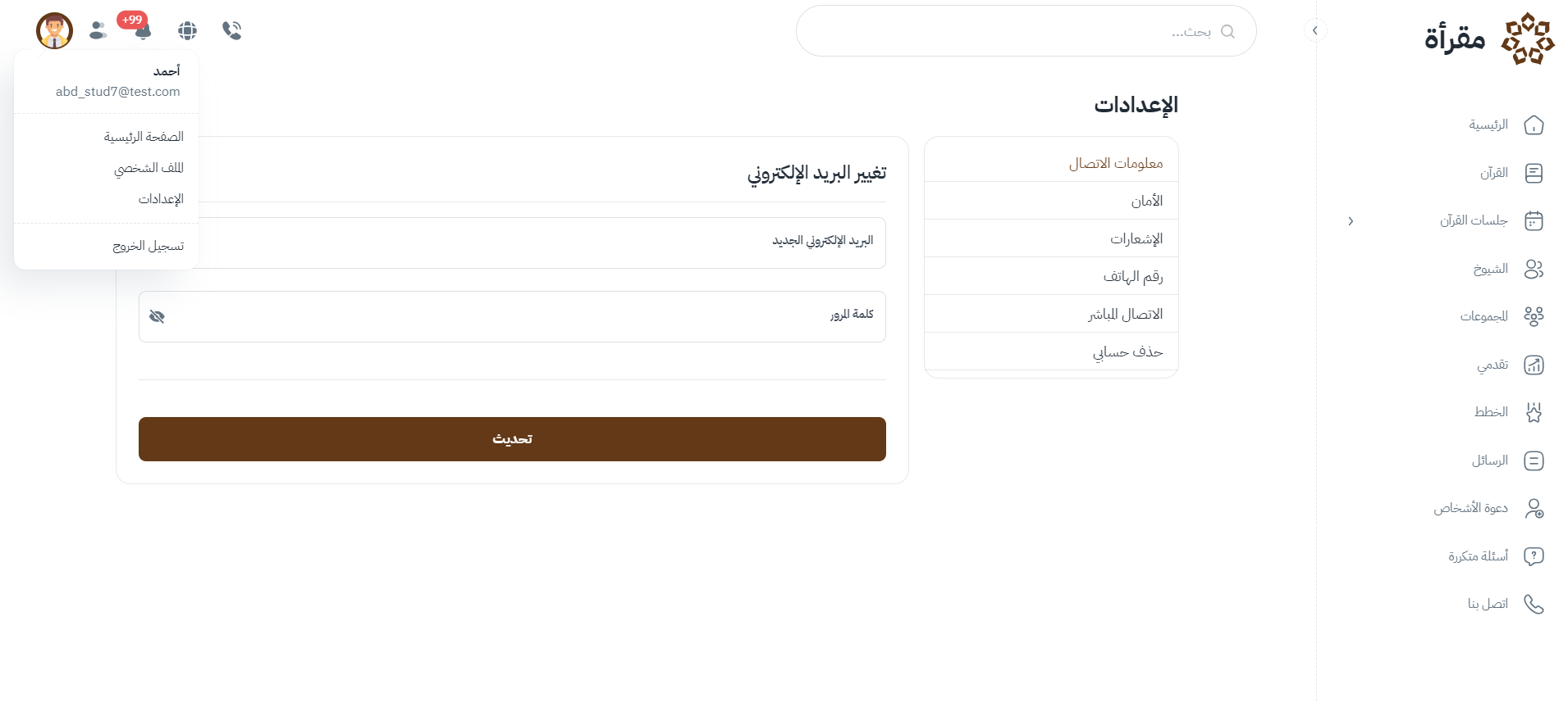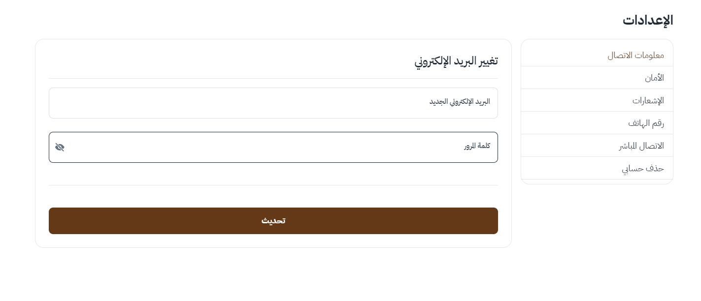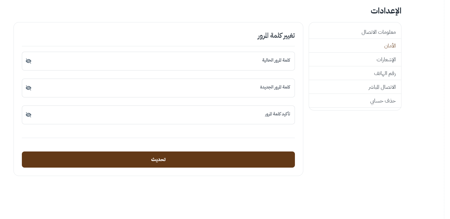 تغيير كلمة المرور : من خلال النقر على أيقونة الأمان في صفحة يظهر قسم الذي يتيح لك تحديث كلمة مرورك لضمان أمان حسابك