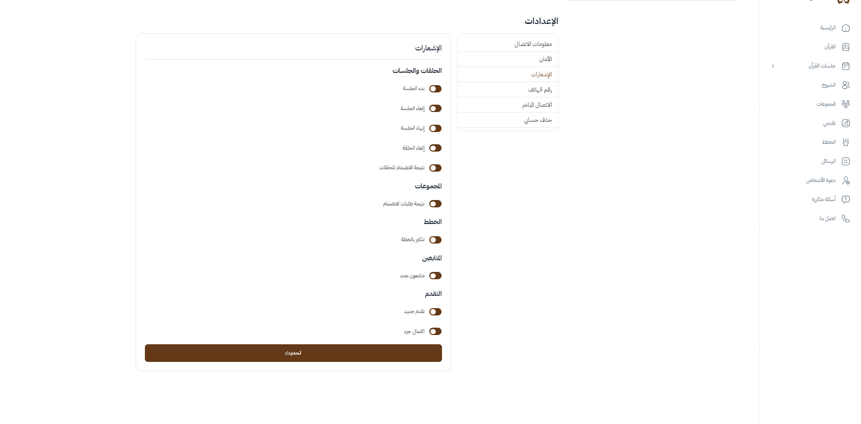 الحلقات والجلسات: يمكنك تفعيل أو إيقاف إشعارات بدء الجلسة، إنهاء الجلسة، إلغاء الجلسة، إلغاء الحلقة، ونتيجة الانضمام للحلقات.
