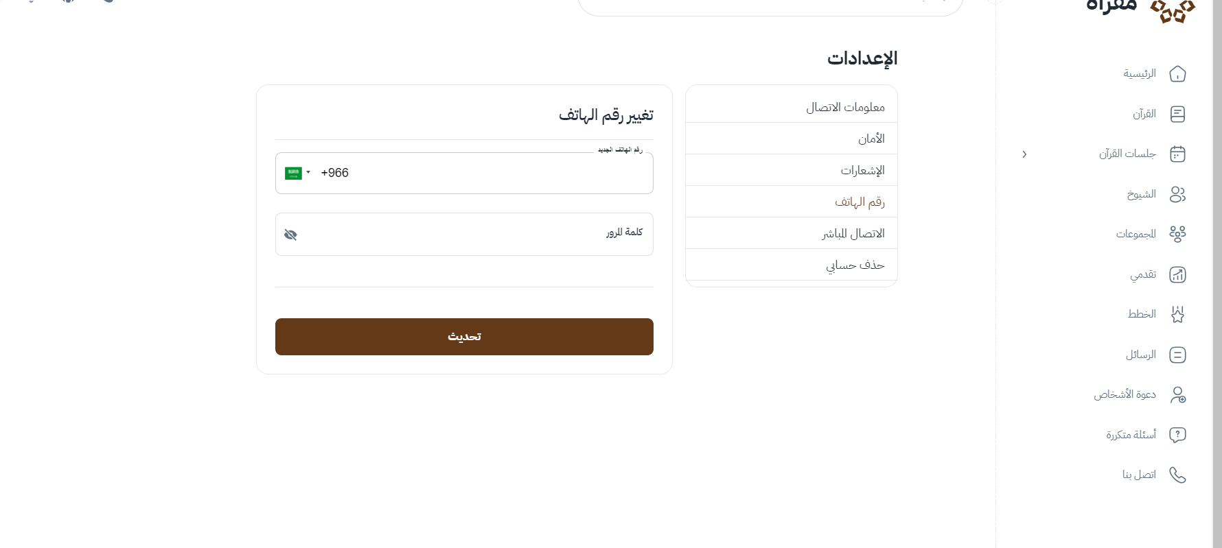 تغيير رقم الهاتف : يظهر قسم "تغيير رقم الهاتف" الذي يتيح لك تحديث رقم هاتفك المرتبط بحسابك. هذا القسم يحتوي على: