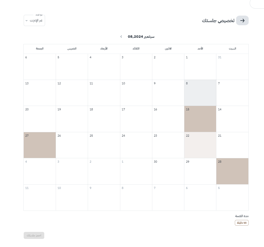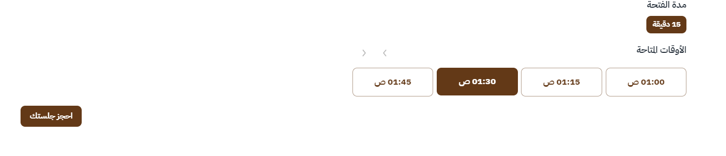 من ثم اختيار التاريخ والوقت الأنسب لك. بعد تحديد اليوم المناسب، يمكنك اختيار فترة زمنية محددة لجلستك، مما يضمن تنظيم وقتك ووقت الإدارة بشكل فعال.