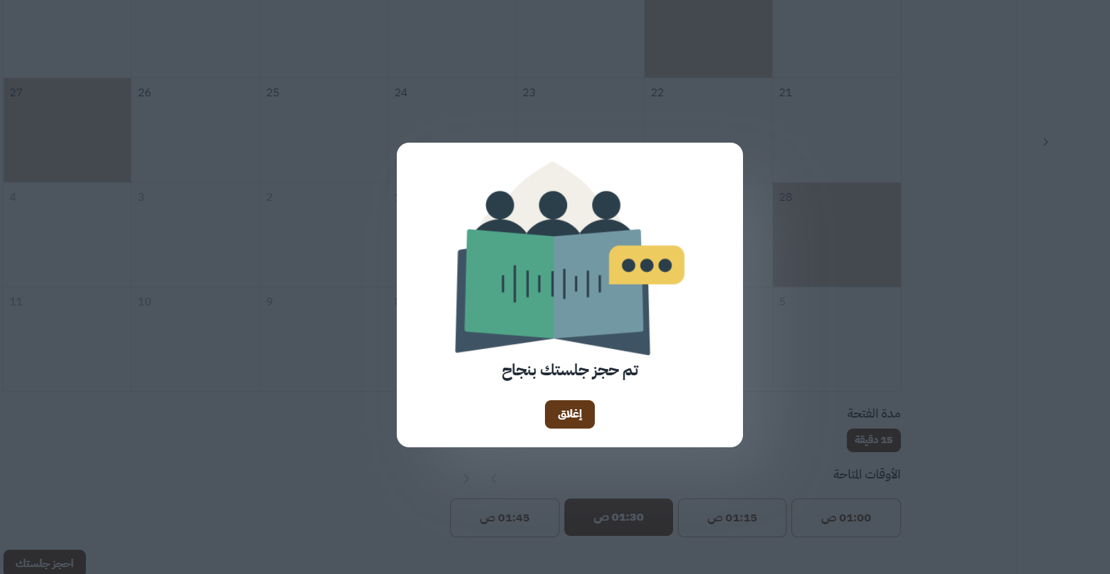 بعد اختيار التاريخ والوقت المناسبين لجلستك، انقر على زر "احجز جلستك" الموجود أسفل الصفحة. عند النقر، سيظهر لك إشعار تأكيد في وسط الشاشة. للعودة إلى الصفحة الرئيسية، ما عليك سوى النقر على زر "إغلاق" الموجود أسفل الإشعار.