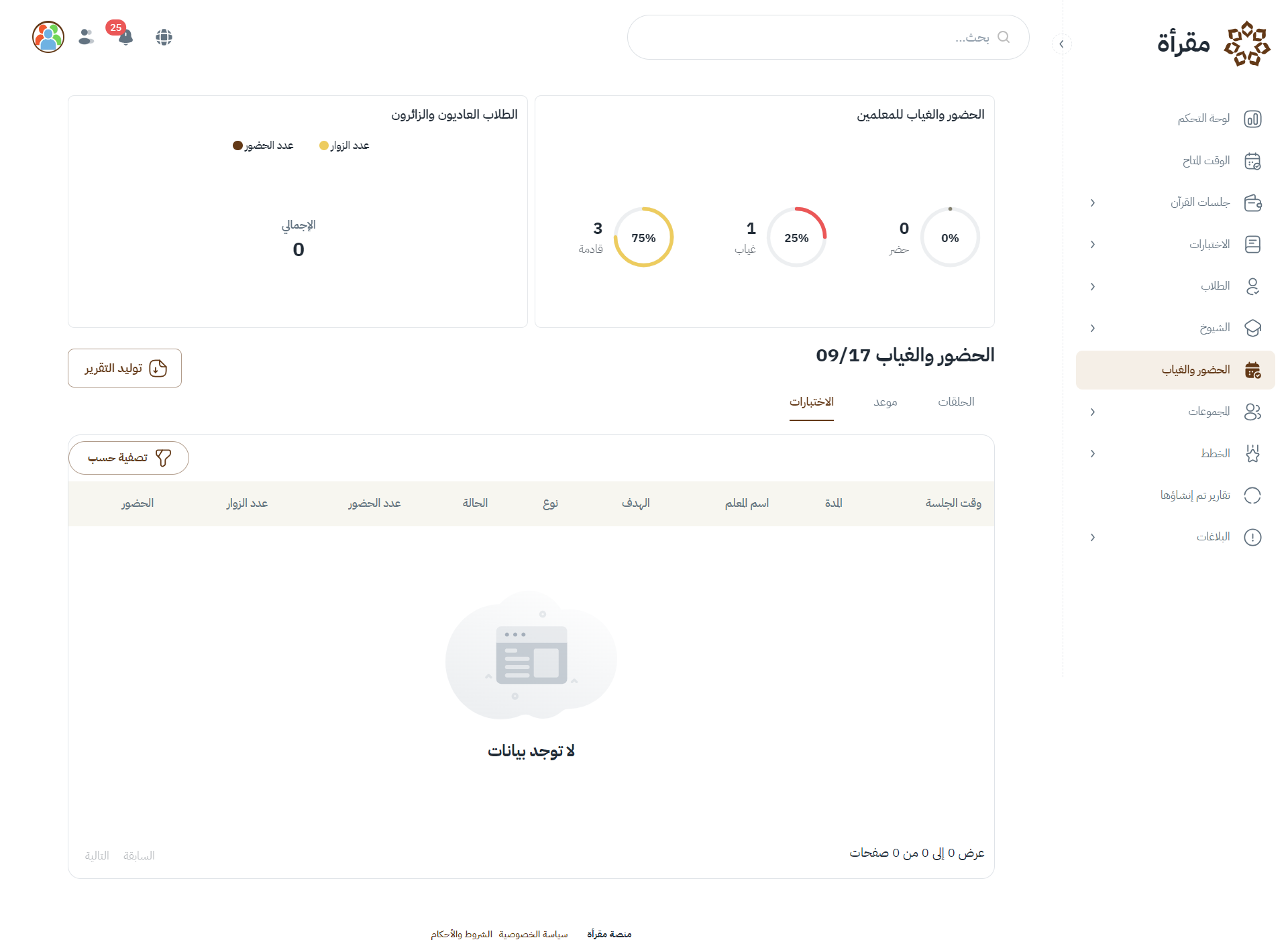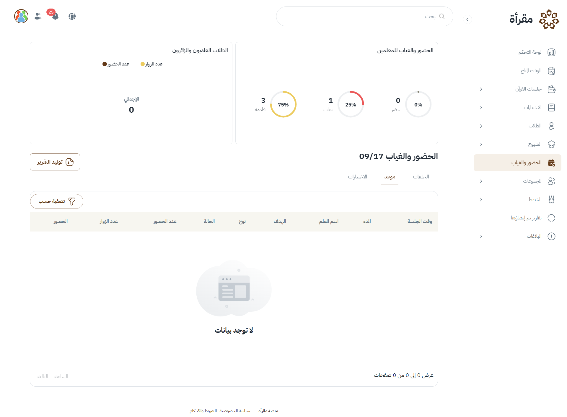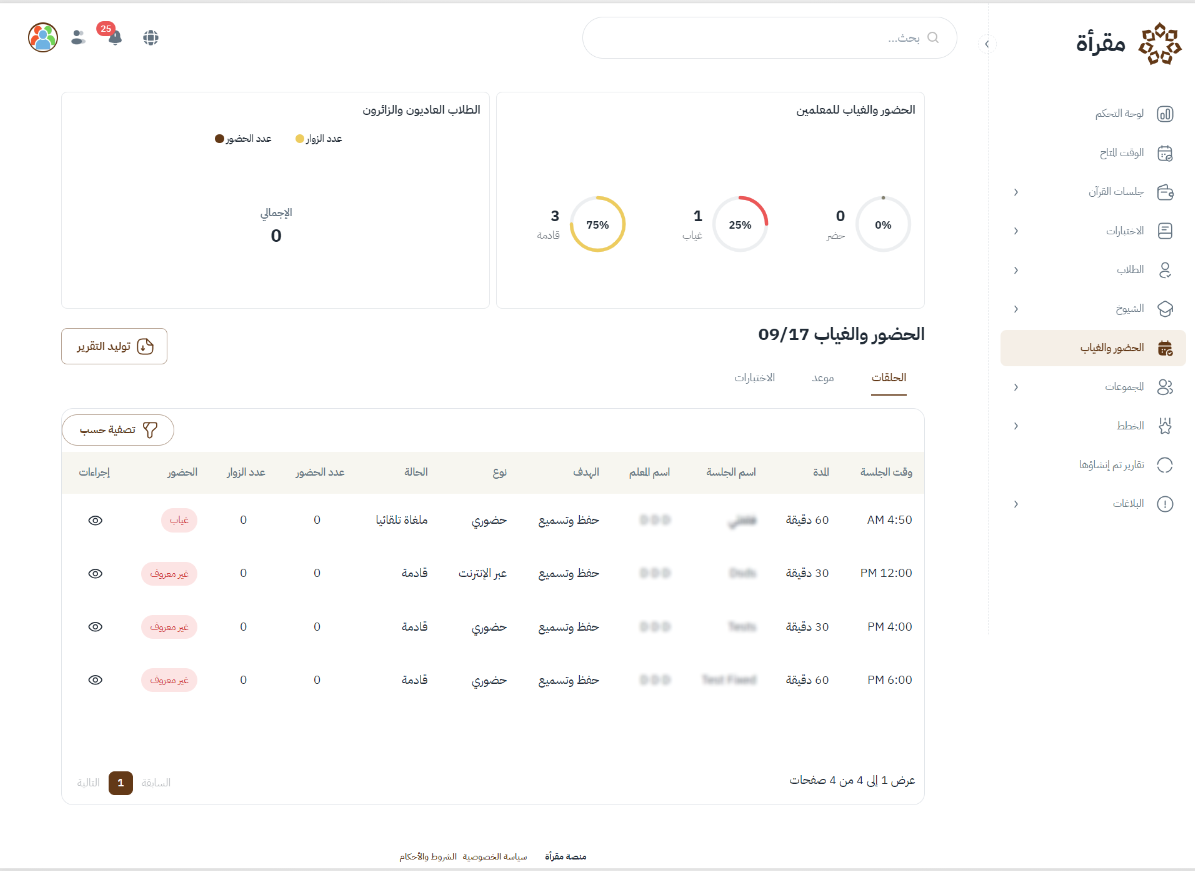 توفر المنصة لوحة تحكم شاملة تعرض إحصائيات الحضور والغياب بشكل واضح ومرئي. نلاحظ أن هناك: