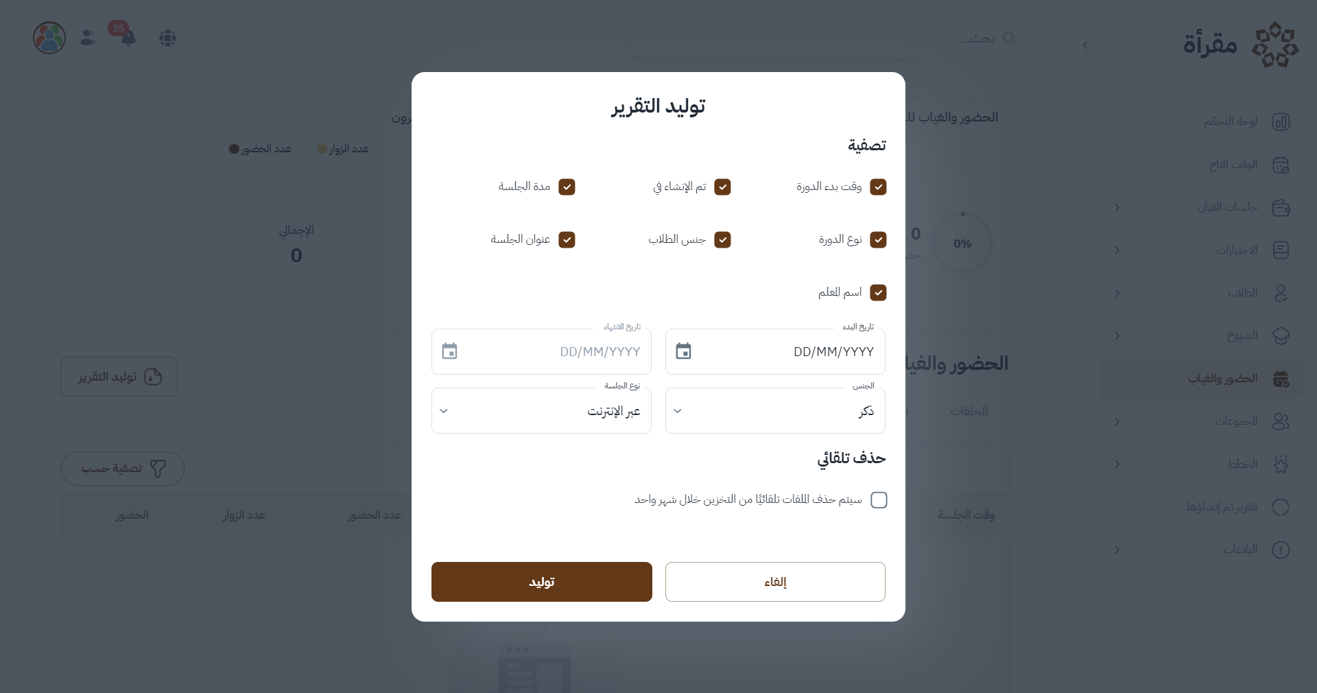 يمكن للمشرف الضغط على أيقونة" توليد تقرير" لإنشاء تقرير عن( الحضور والغياب في الحلقات والمواعيد والاختبارات )
