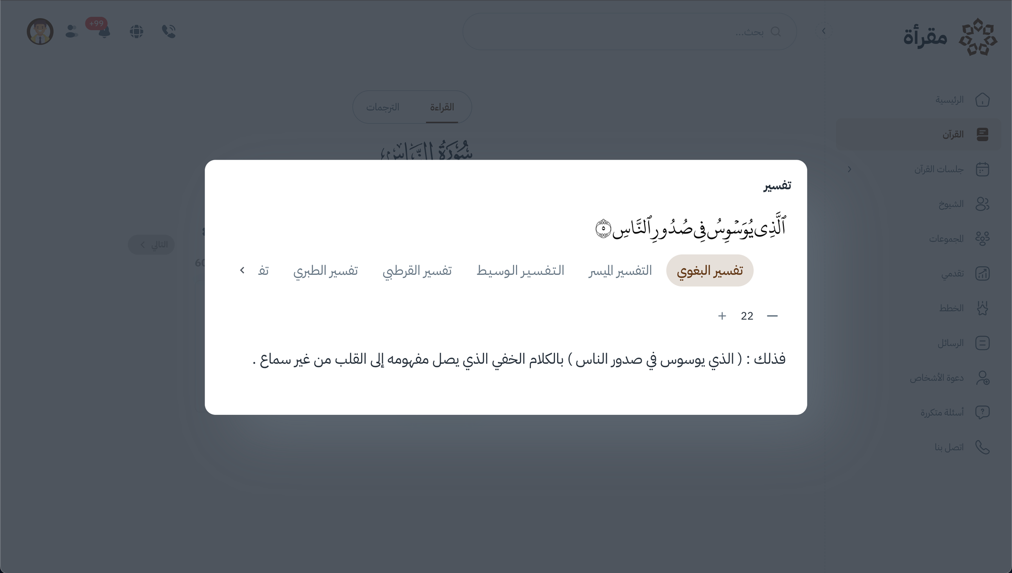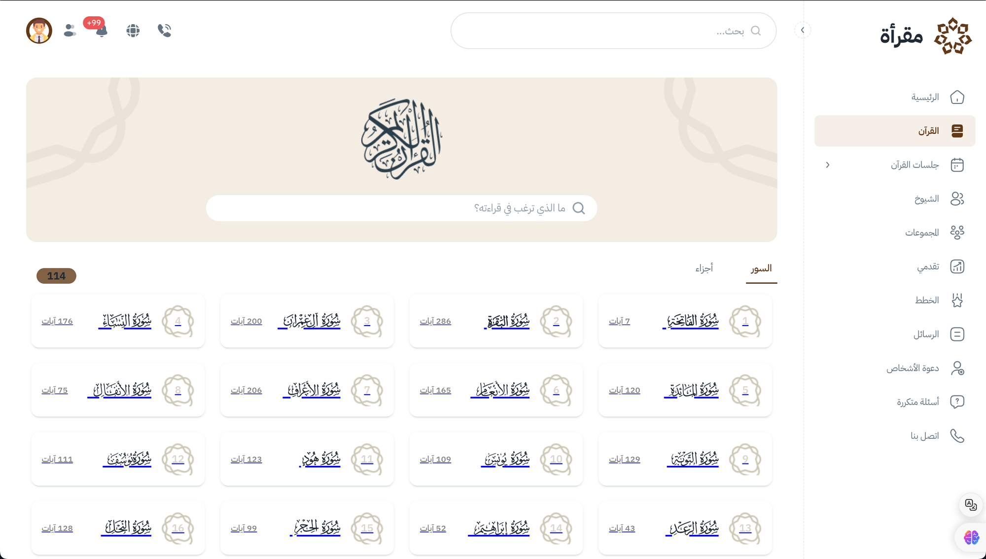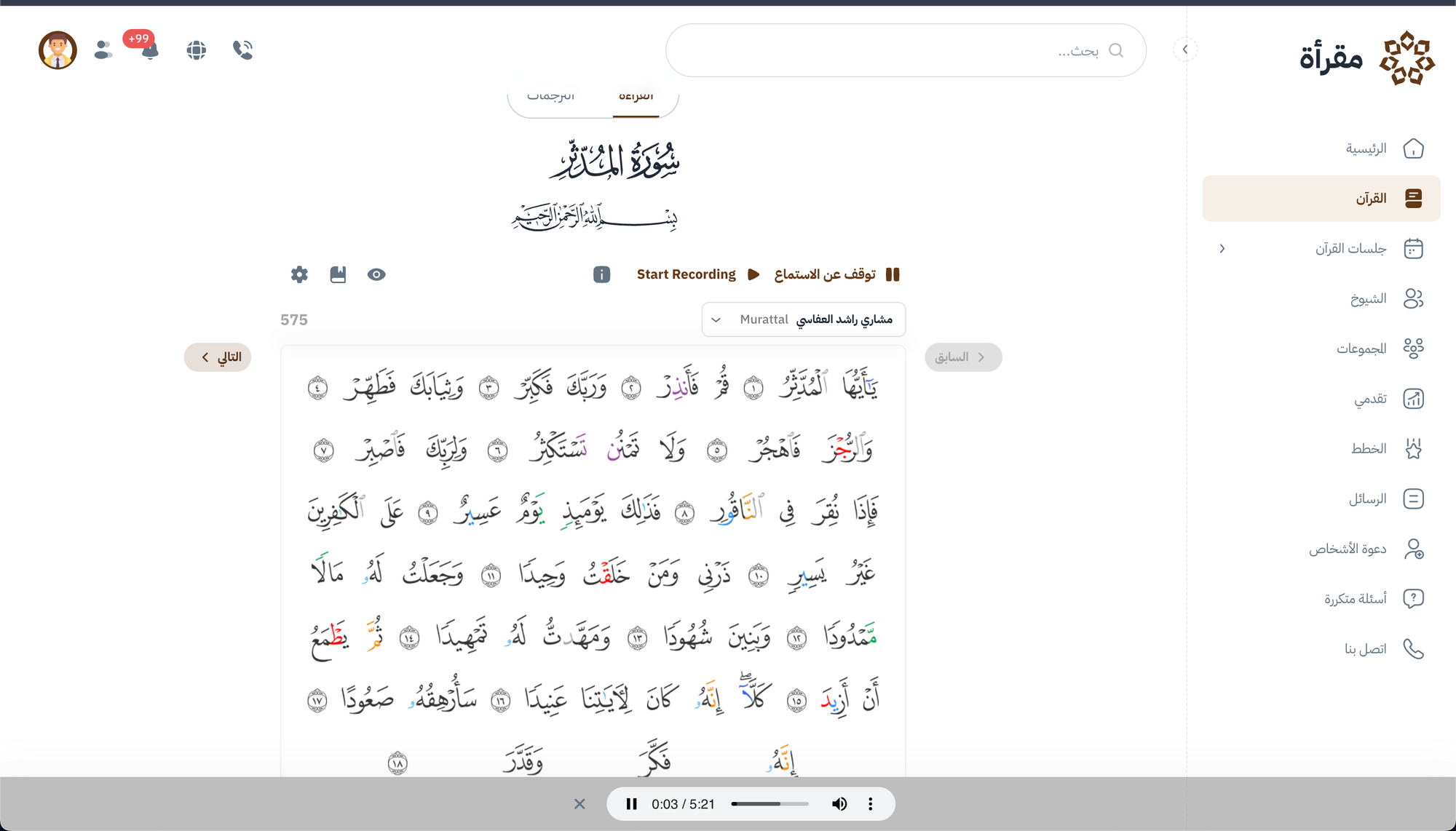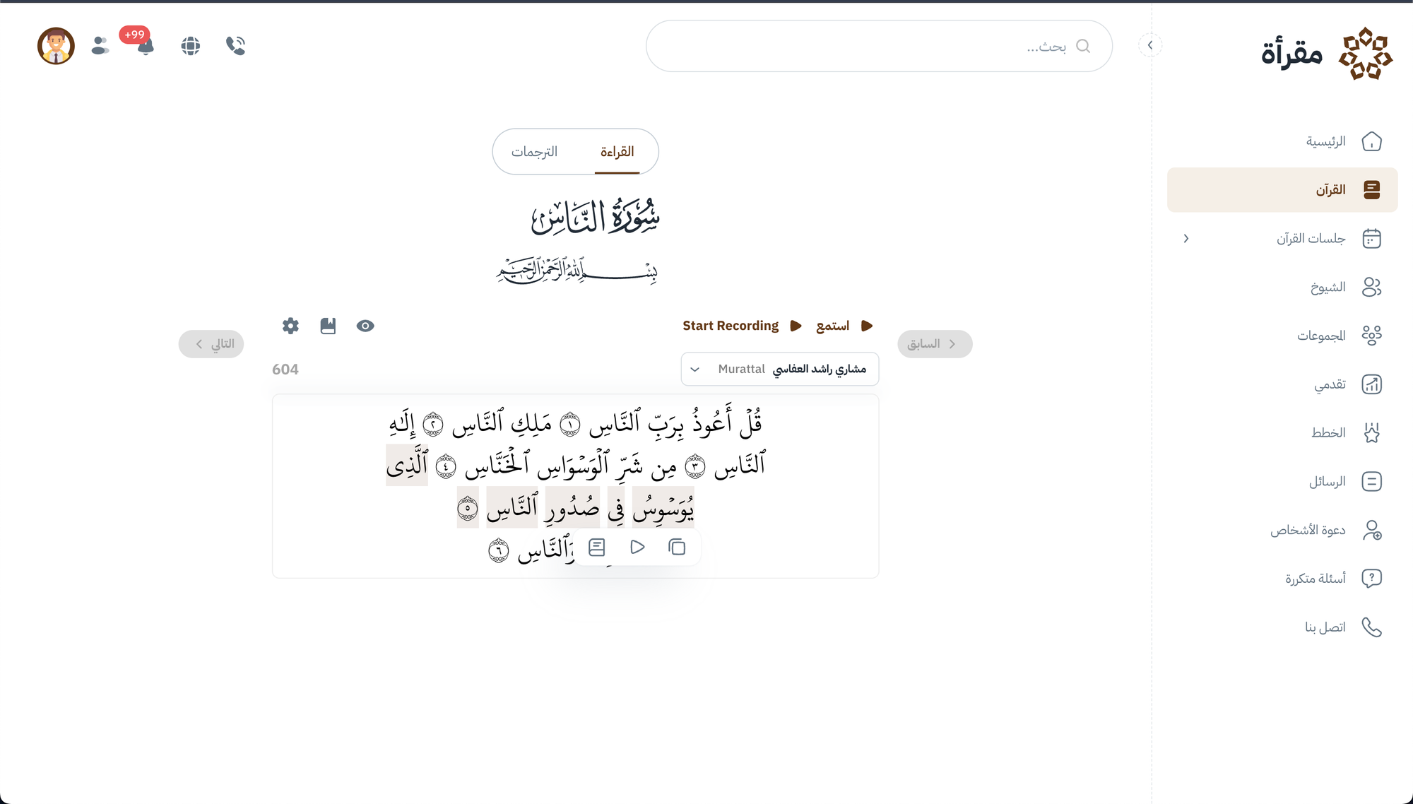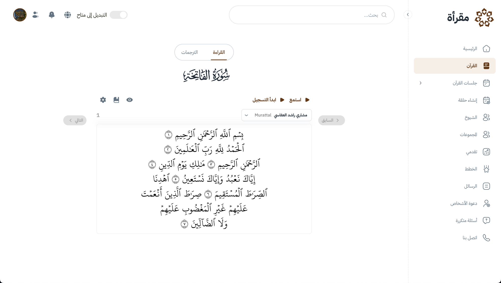 يقدم قسم القرآن تجربة تلاوة واستماع والتسميع الذكي للمصحف.