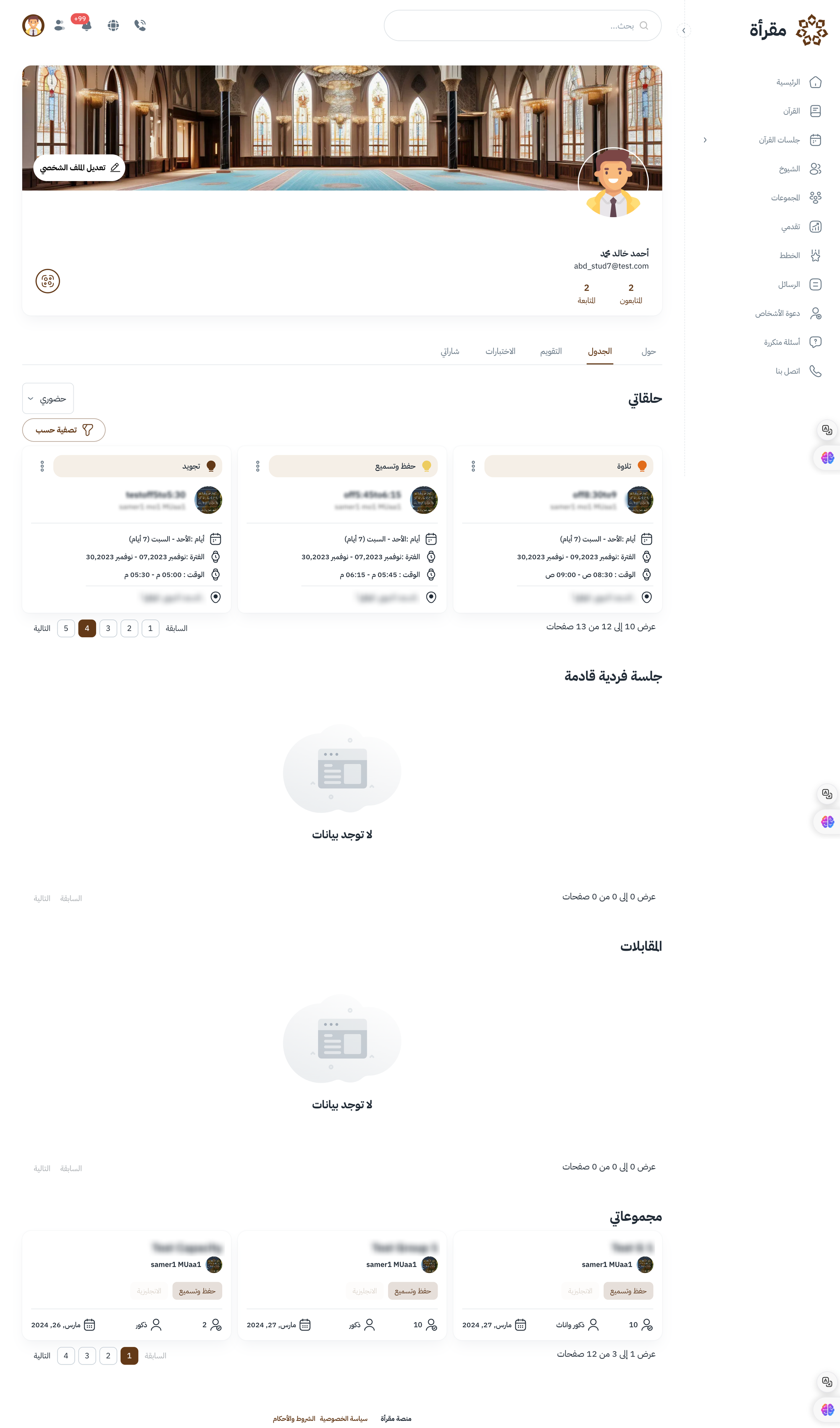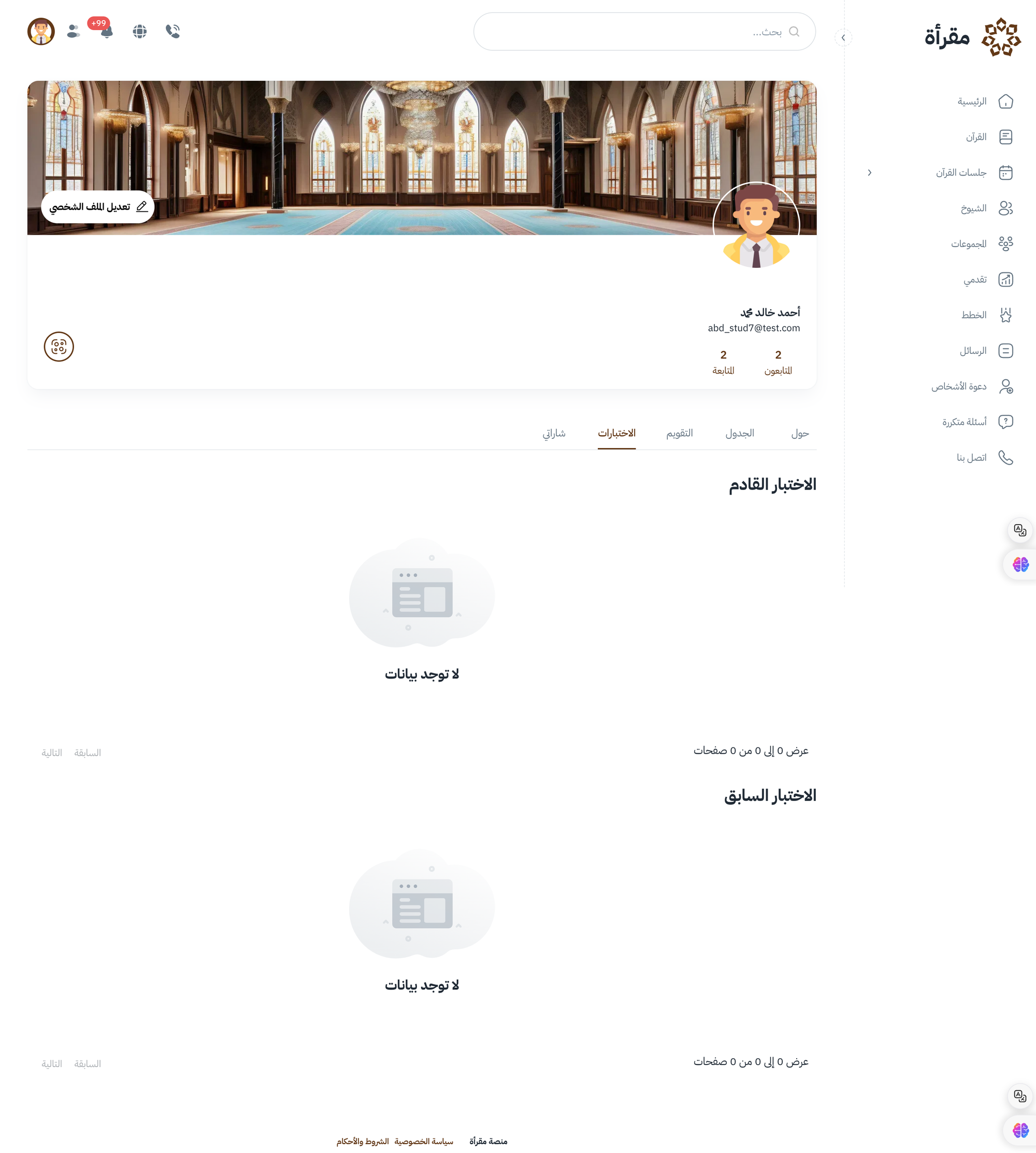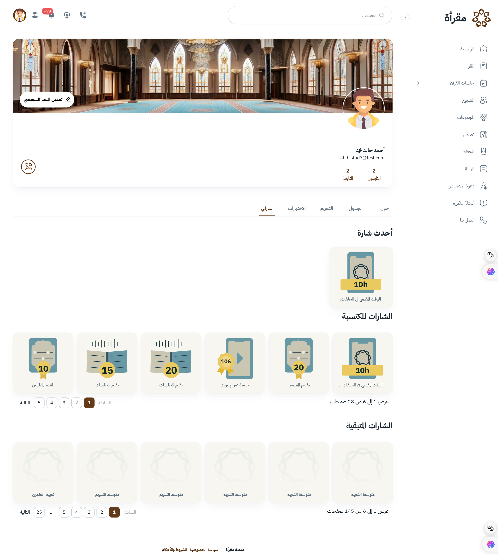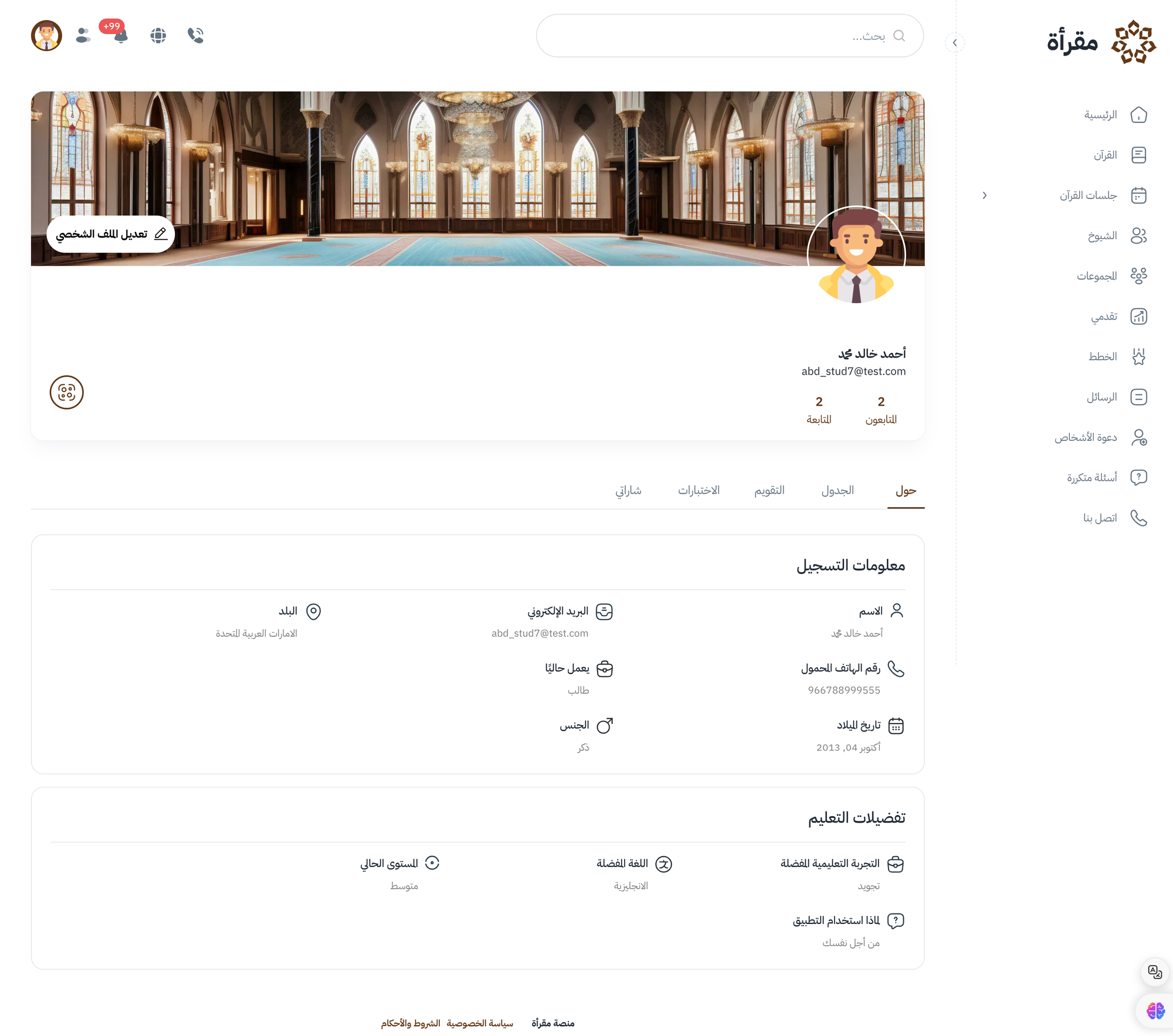 تذكر أن الملف الشخصي هو مرآة لرحلتك في تعلم القرآن الكريم. حافظ على تحديث معلوماتك وراجع تقدمك باستمرار لتحقيق أقصى استفادة من تجربتك التعليمية على منصة مقرأة.