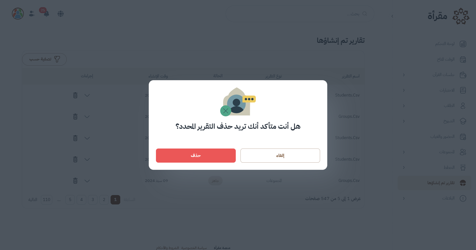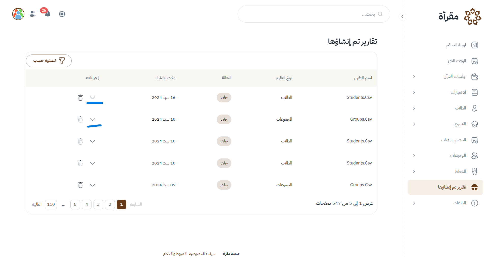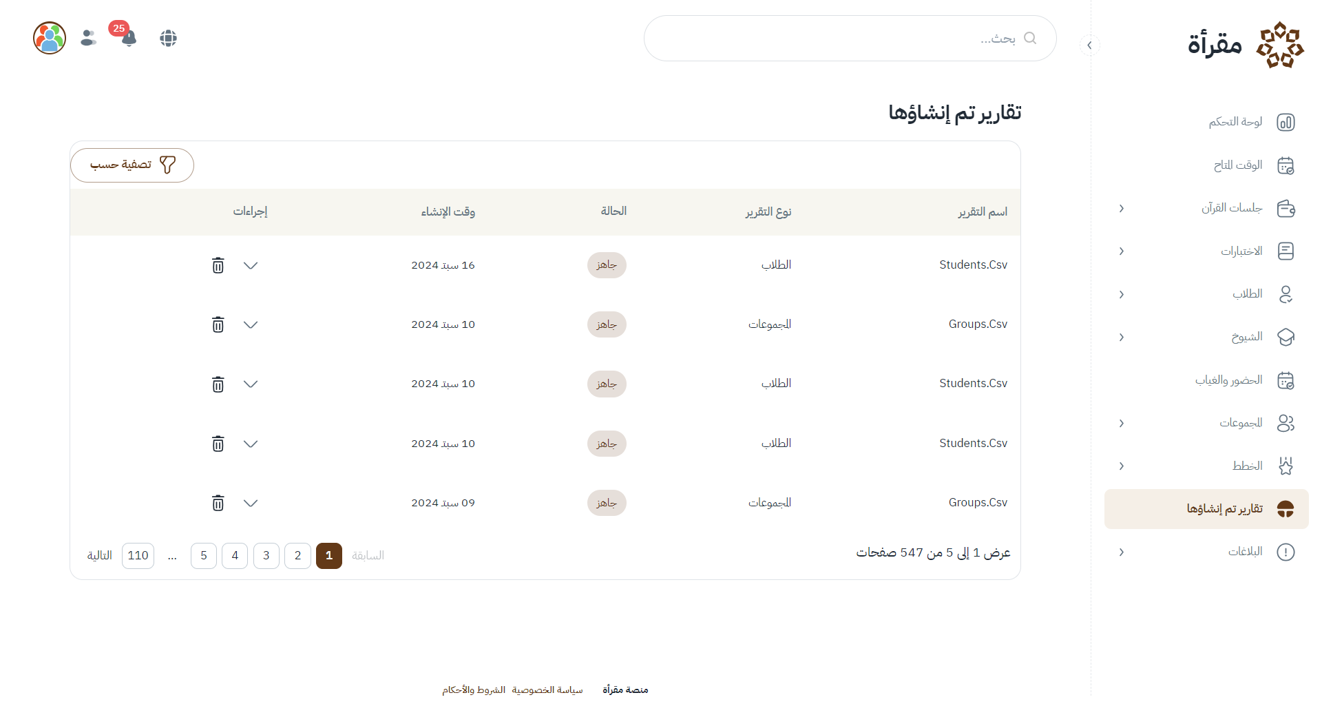 واجهة "تقارير تم إنشاؤها" في مقرأة اقرأ توفر نظرة شاملة ومنظمة للتقارير التي تم إنشاؤها في النظام. هذه الواجهة تتميز بعدة خصائص مهمة:
