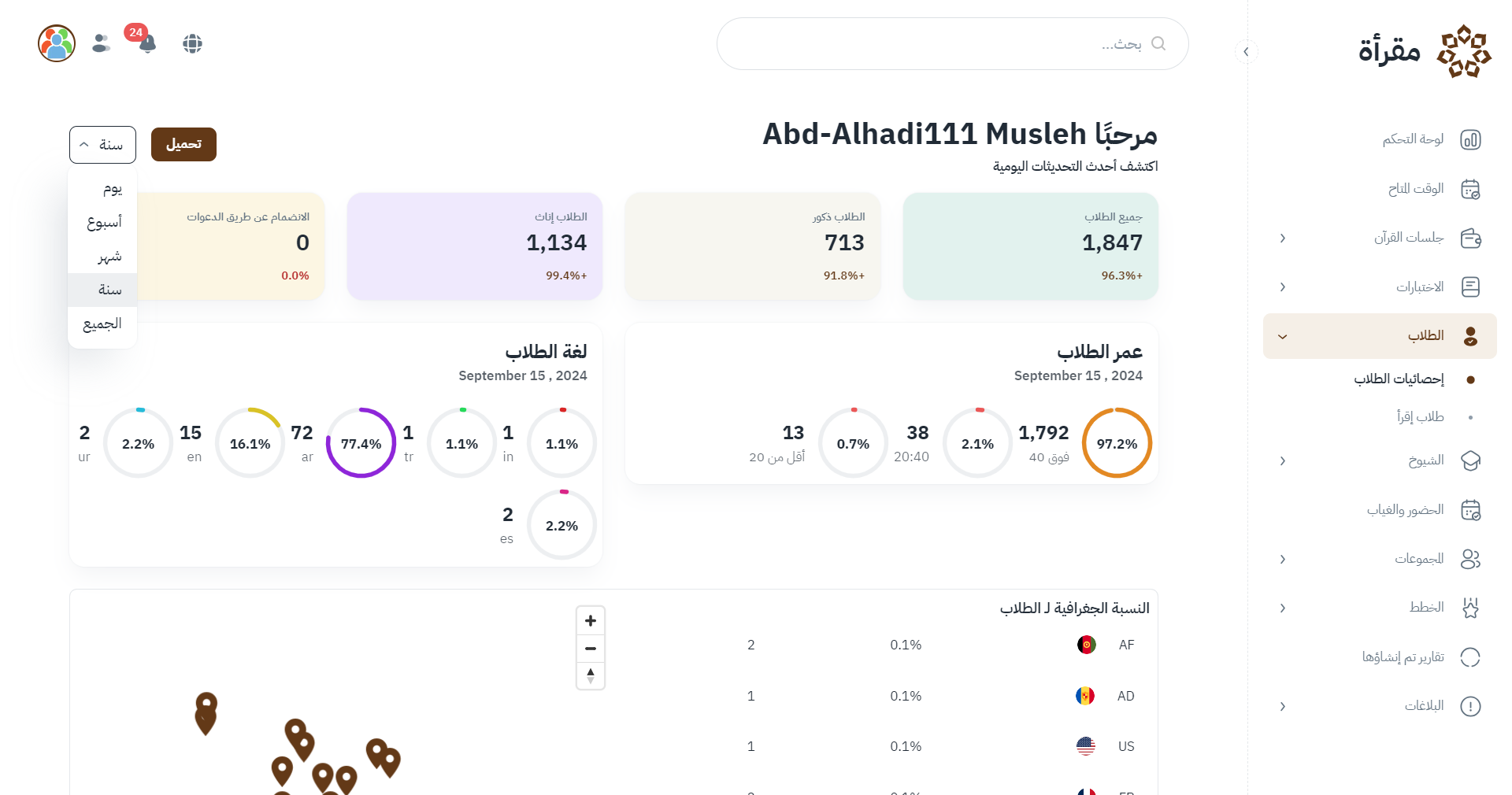 يوفر هذا القسم نظرة شاملة ومفصلة عن أداء الطلاب، ويشمل مؤشرات ورسومات بيانية تعكس أعداد الطلاب وأعمارهم ، النسب الجغرافية ، ومعدلات النجاح. تساعد هذه البيانات في تقييم فعالية البرامج التعليمية وتحديد مجالات التحسين.