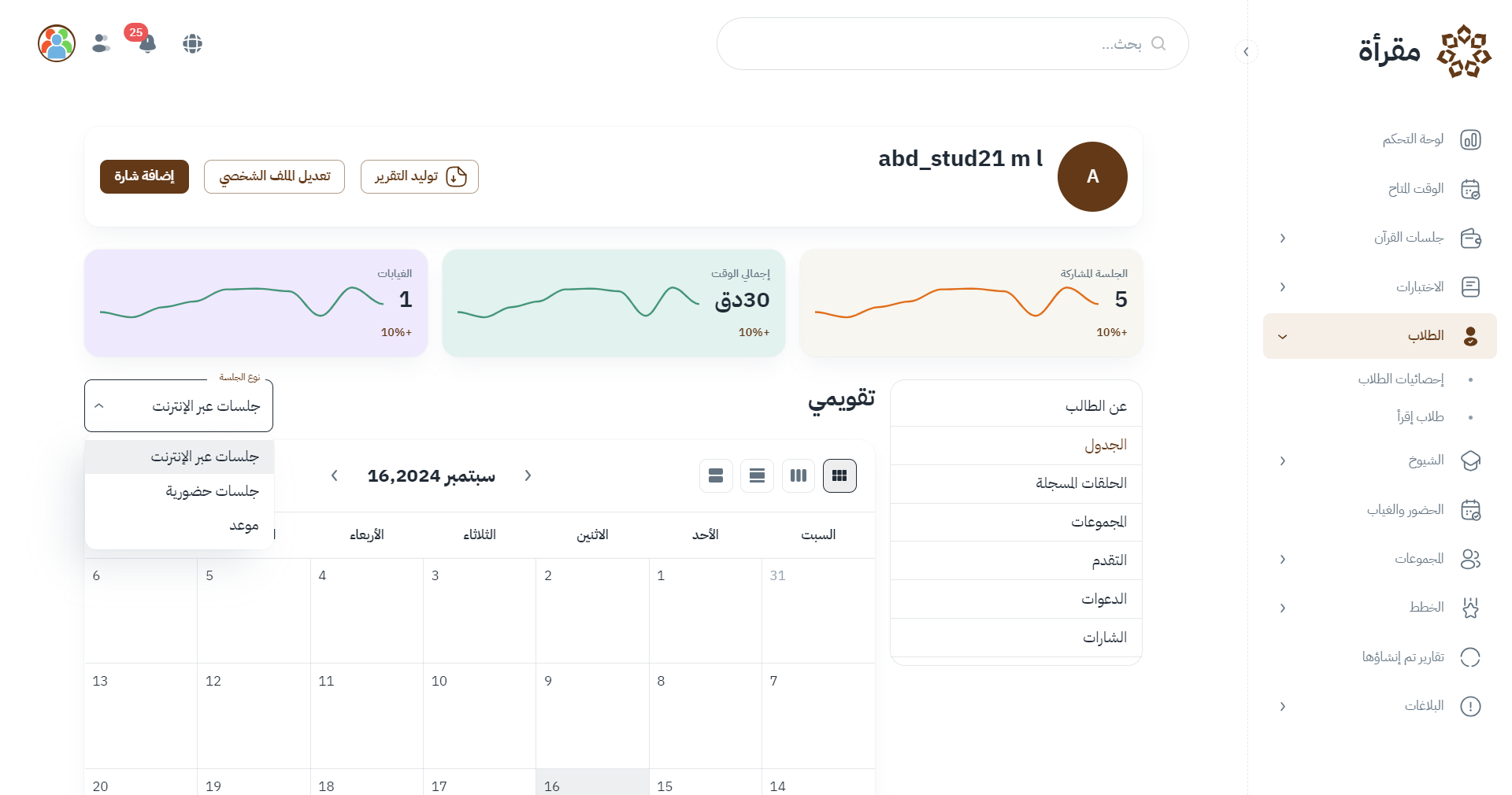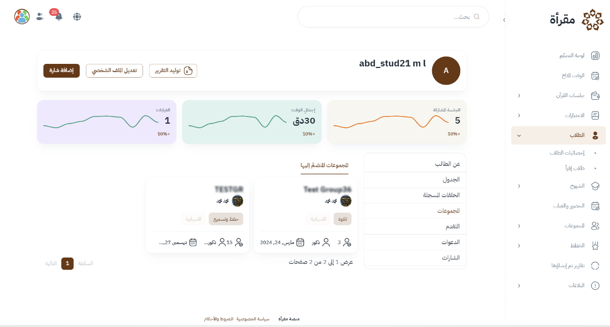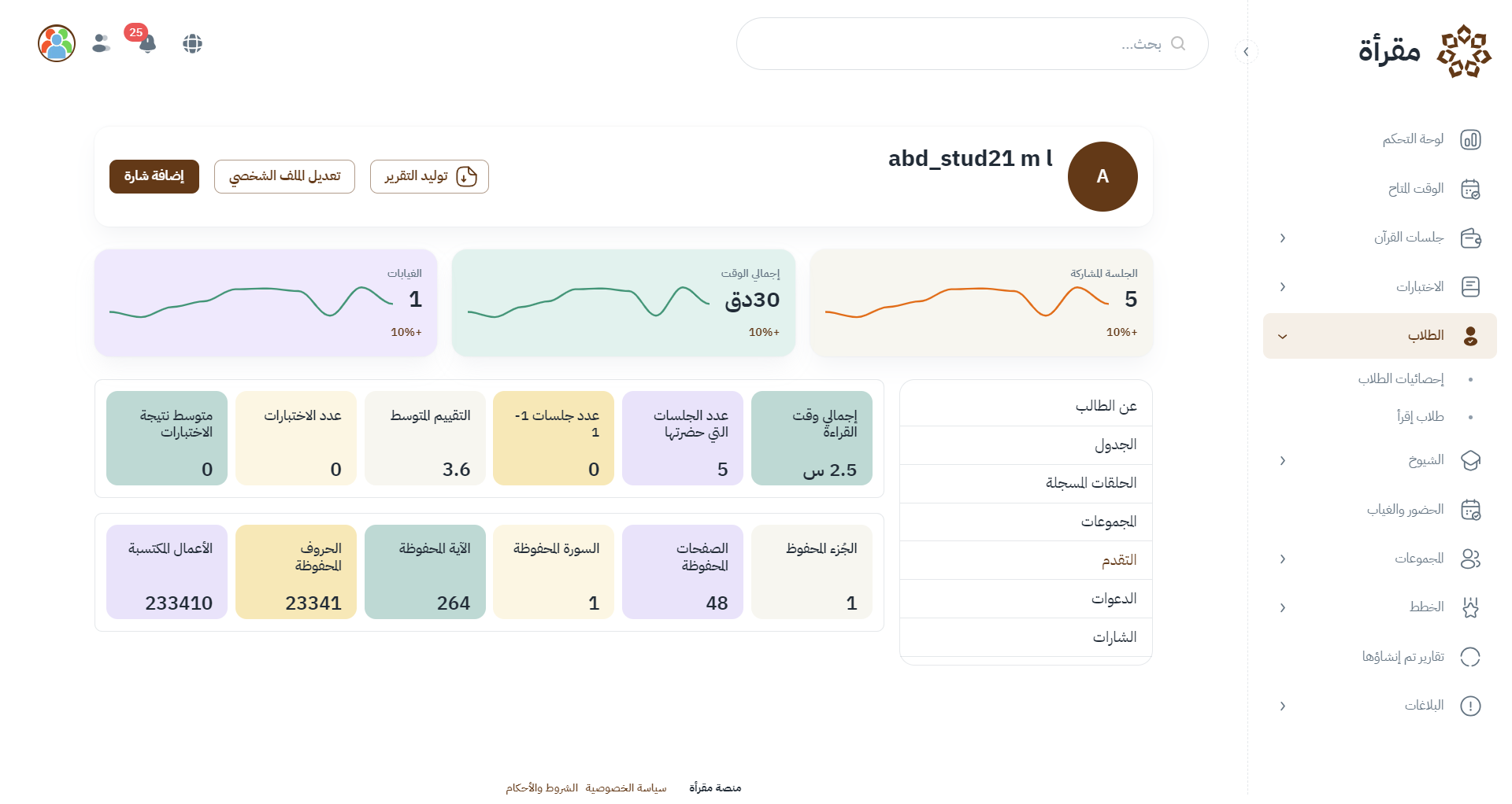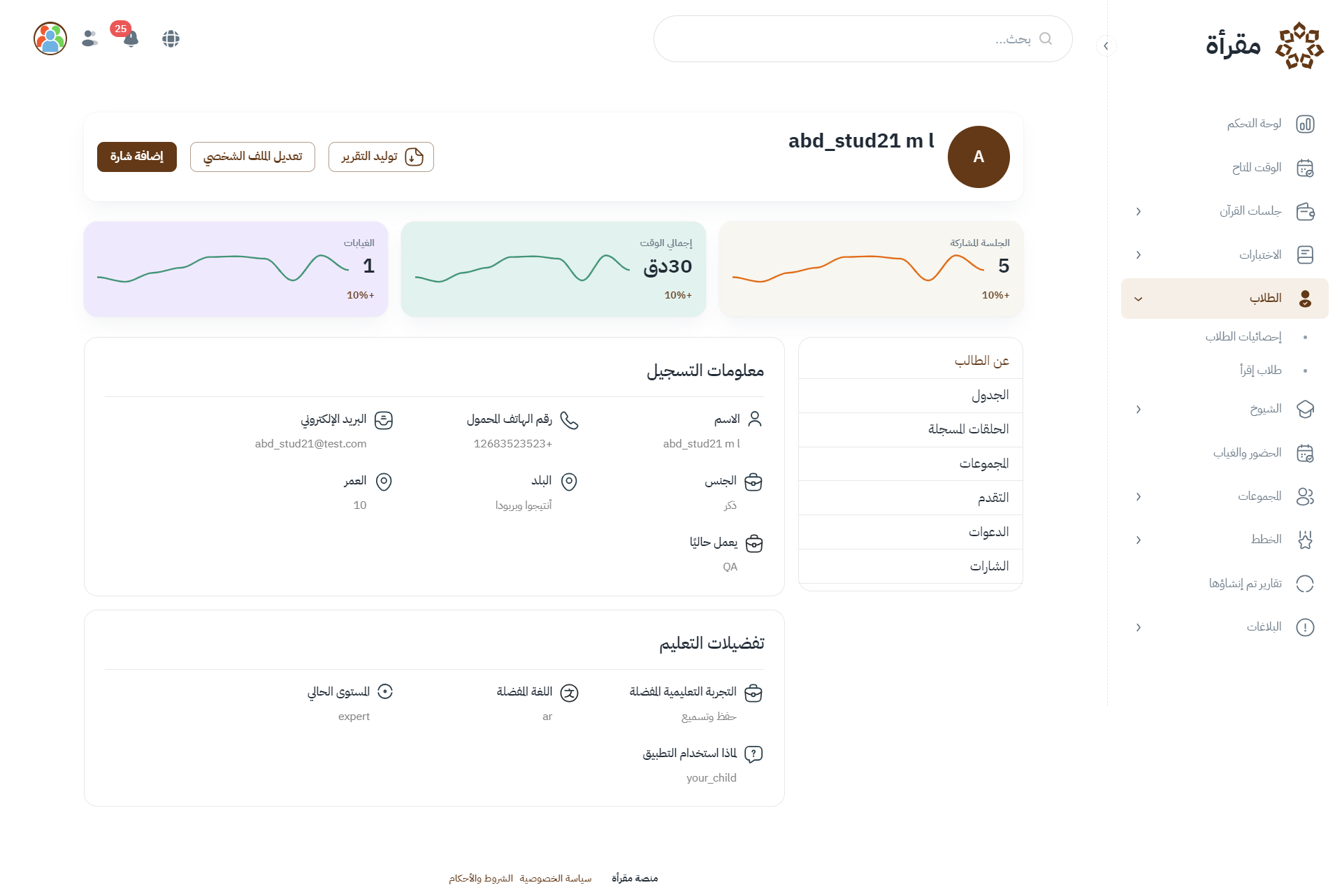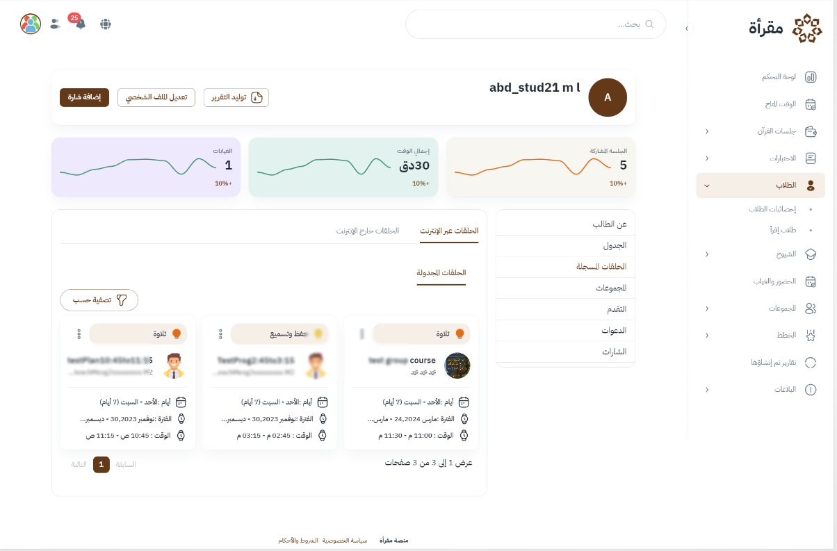 صفحة معلومات الطالب في منصة "مقرأة" تقدم نظرة شاملة ومنظمة عن كل طالب، موزعة على ثلاثة أقسام رئيسية: