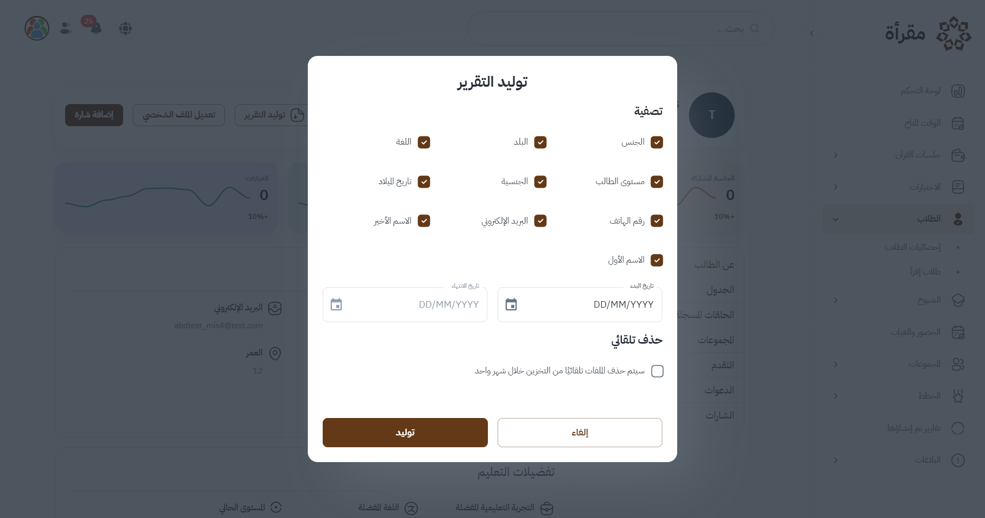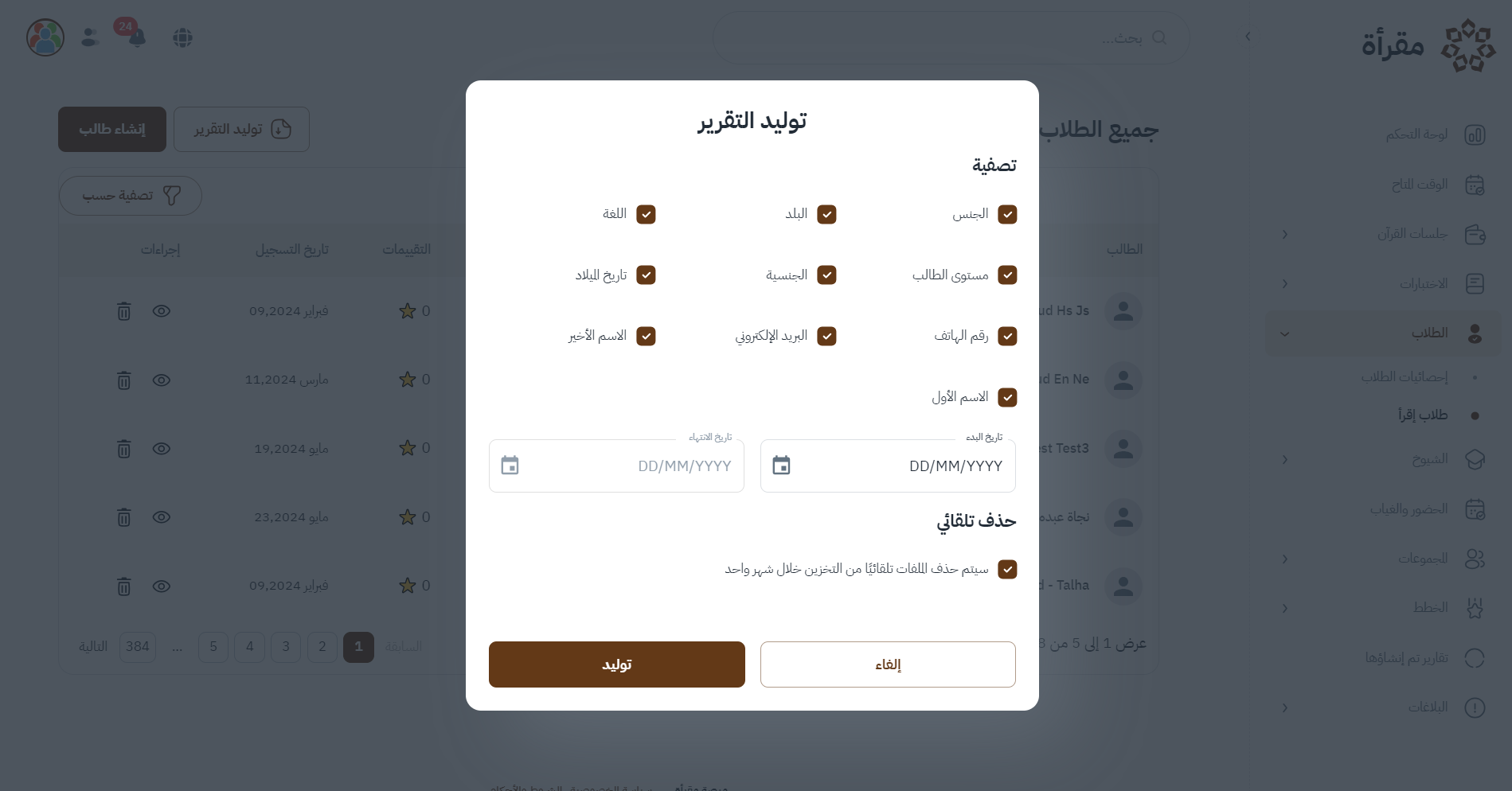 تتيح منصة إدارة طلاب "اقرأ" للمشرفين ميزة متقدمة لإنشاء تقارير شاملة عن معلومات الطلاب، مع مرونة في تحديد النطاق الزمني وخاصية الحذف التلقائي: