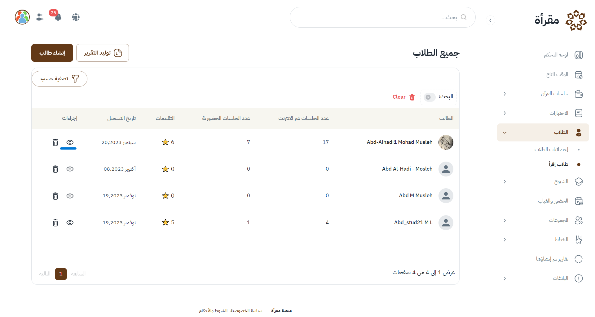 نقسم إدارة الطلاب في منصة "مقرأة" إلى محورين رئيسيين: