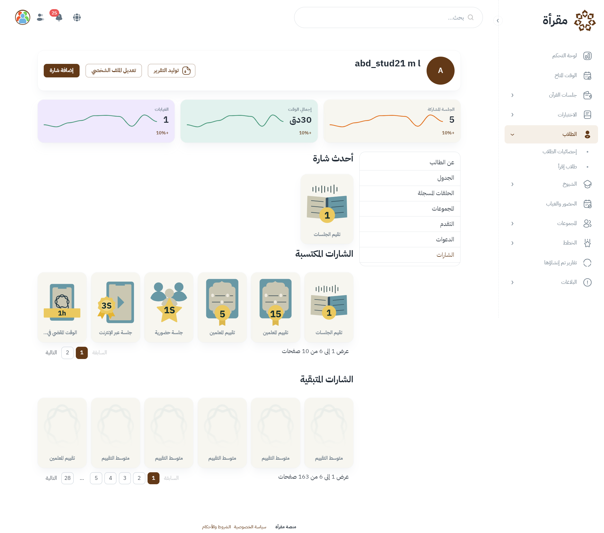 تقدم منصة مقرأة صفحة متخصصة لعرض الشارات التي حاز عليها الطالب خلال مسيرته في مقرأة
