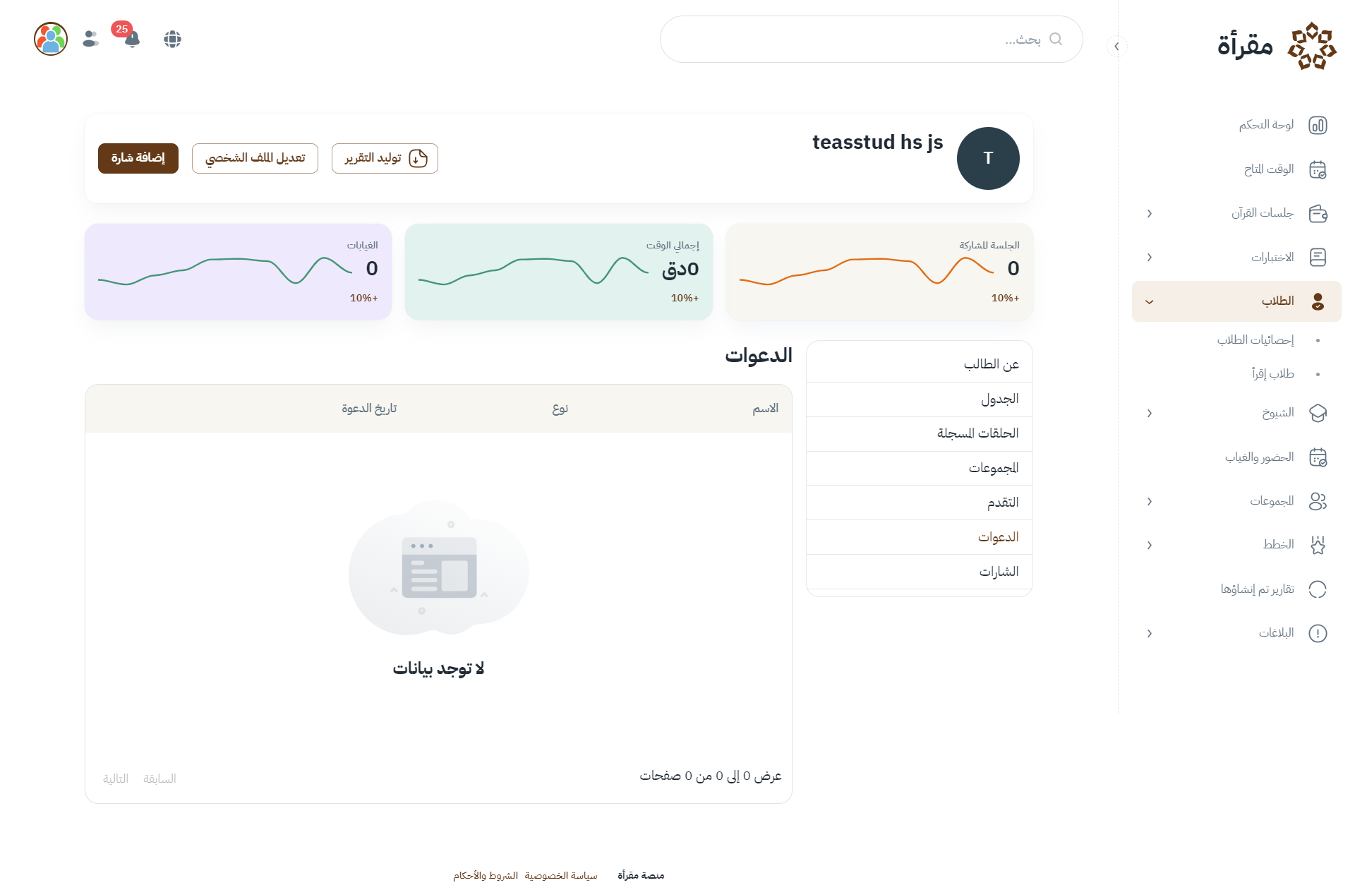 تقدم منصة "مقرأه" صفحة مخصصة لأعداد الأشخاص التي تمت دعوتهم من قبل الطالب وتشمل عدة نقاط رئيسية :