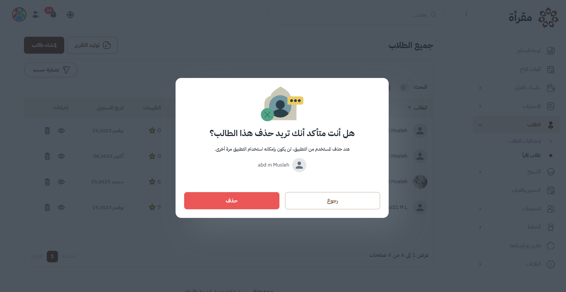 يمكن للمشرف حذف الطالب من خلال الضغط على أيقونة ( السلة )
