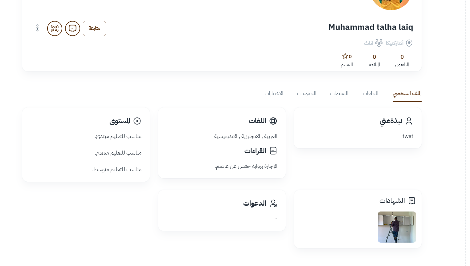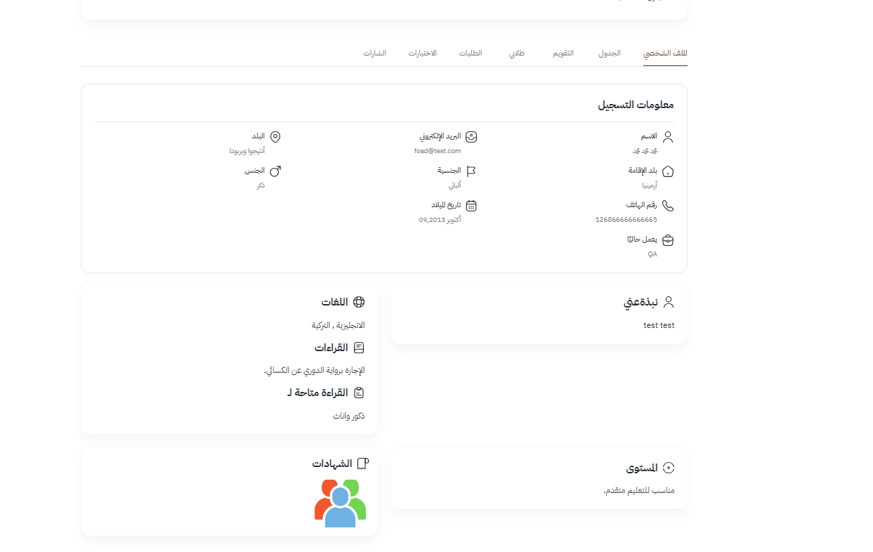 ( نبذة عن الطالب - اللغات التي يجيدها الطالب - القراءات التي حاز عليها - الشهادات - الدعوات التي قام بها - المستوى الخاص بالطالب )