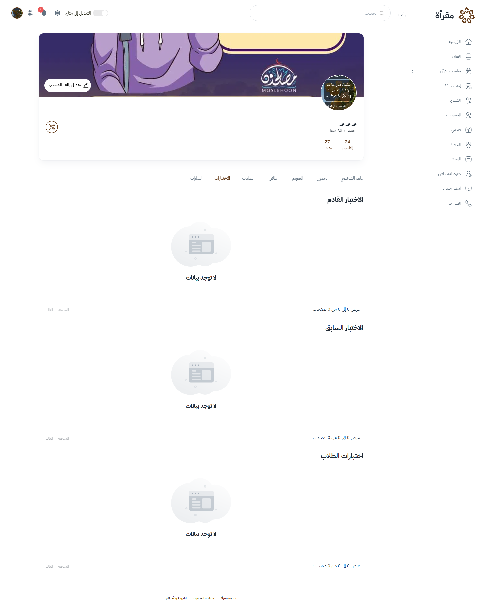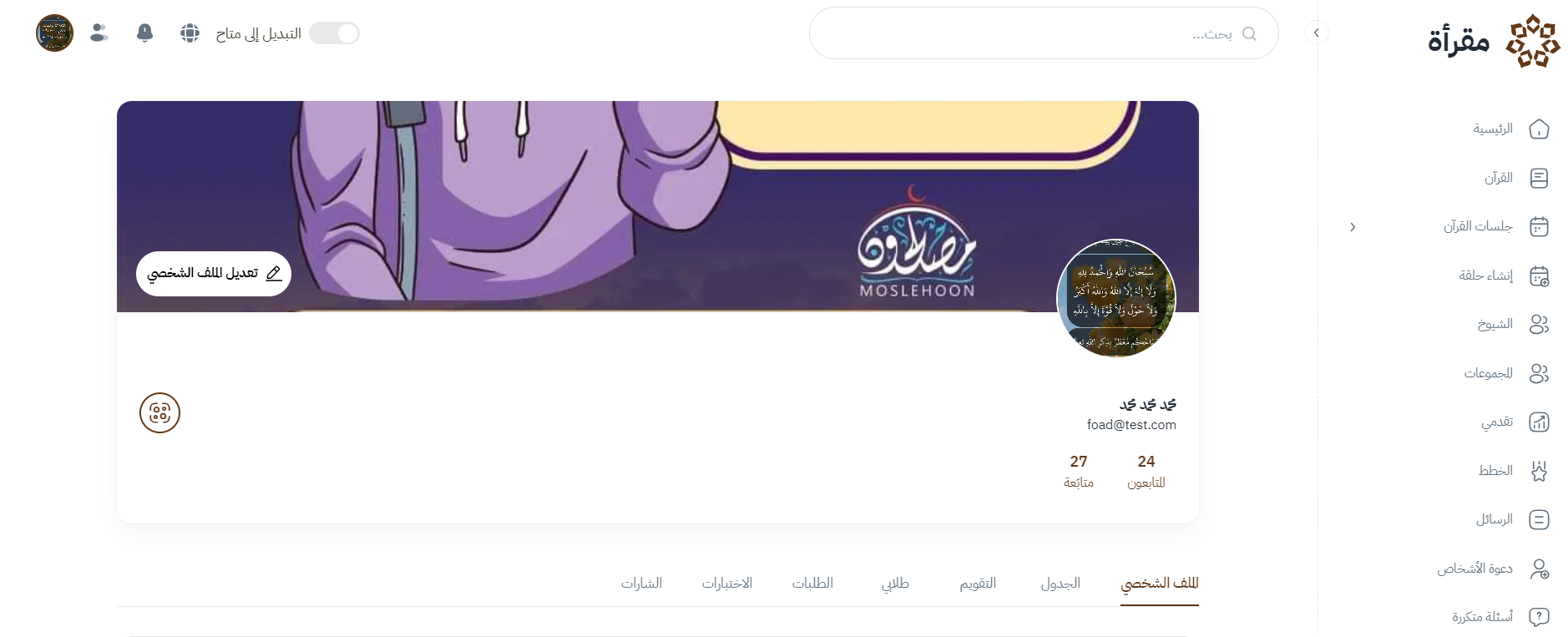 - يحتوي على أقسام: الملف الشخصي، الجدول، التقويم، طلابي، الطلبات، الاختبارات، المسارات