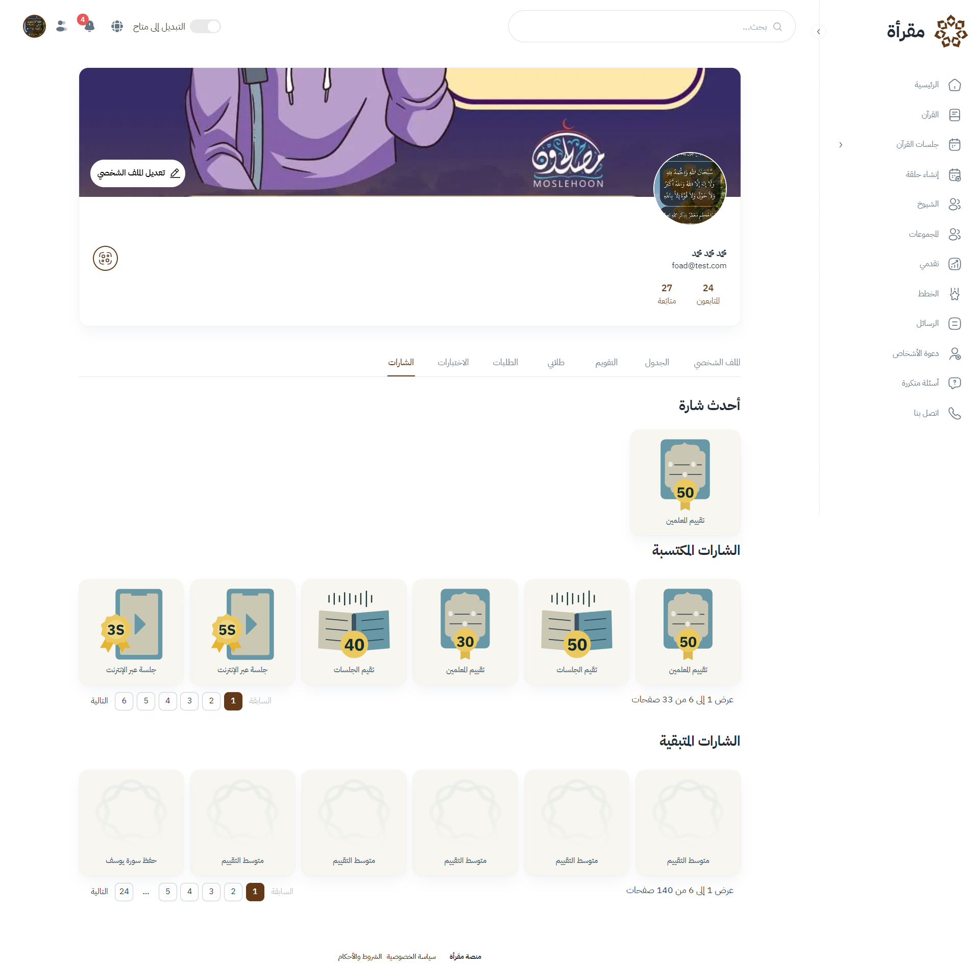 2- الشارات المكتسبة : يظهر هذا القسم الشارات التي حصل عليها المعلم