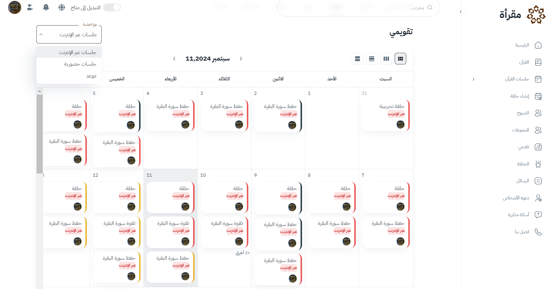 التقويم في مقرأة اقرأ يعمل كأداة تنظيمية شاملة لجدول المعلم، حيث يقدم: