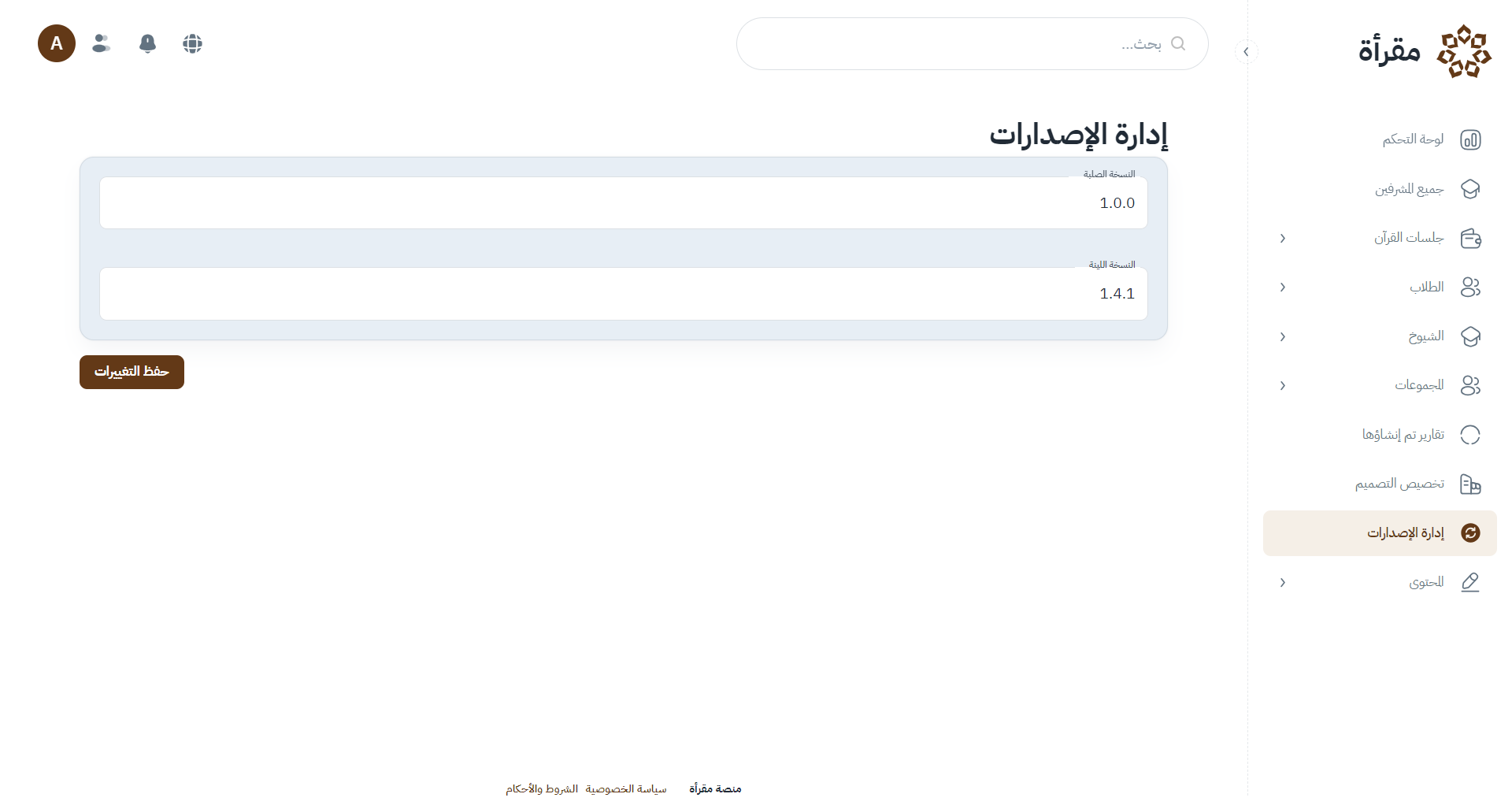 إدارة المنصة إدارة الاصدارات يمكنك من خلال هذه الصفحة تحديد وتحديث الإصدارات الخاصة بالبرنامج السابق التالي